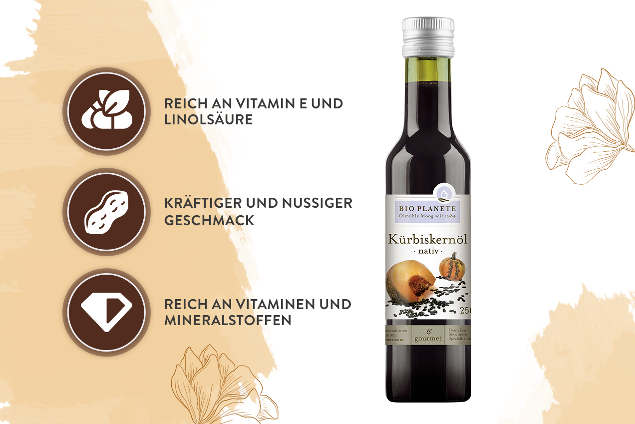 Schon wenige Tropfen dieses feinen Gourmet-Öls runden Salate, Dips, Dressings, Suppen wie leckere Kürbissuppe, aber auch grüne Smoothies ab. Natives Kürbiskernöl ist nicht zum Braten geeignet und darf nur vorsichtig erhitzt werden. Sogar in selbstgebackenem Kuchen ist das native Kürbiskernöl ein absolutes Geschmackserlebnis: Wie wäre es mit Gemüsequiche oder köstlichem Kürbiskuchen?